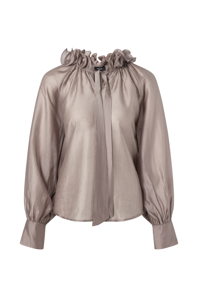 Superweiche Bluse aus elegantem Stoff mit leichtem Glanz. Der V-Ausschnitt ist auf beiden Seiten mit schönen Rüschen und Bändern verziert. Lange Ballonärmel mit Raglannaht oben und einem breiten Bündchen unten, das die Weite einfängt, sowie einem Schlitz und einem Knopf. Das Modell ist großzügig mit einer weiten Passform geschnitten. Die Gesamtlänge in Größe S beträgt 65 cm vom höchsten Punkt unter dem Volant. Das Model auf dem Bild ist 178 cm groß und trägt Größe S.