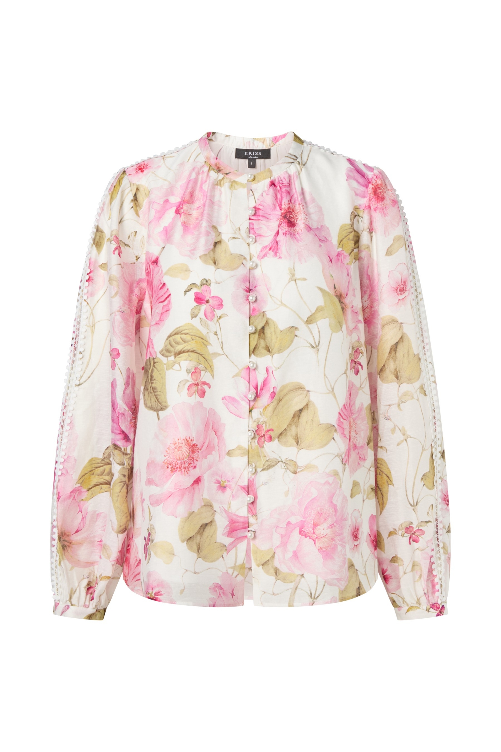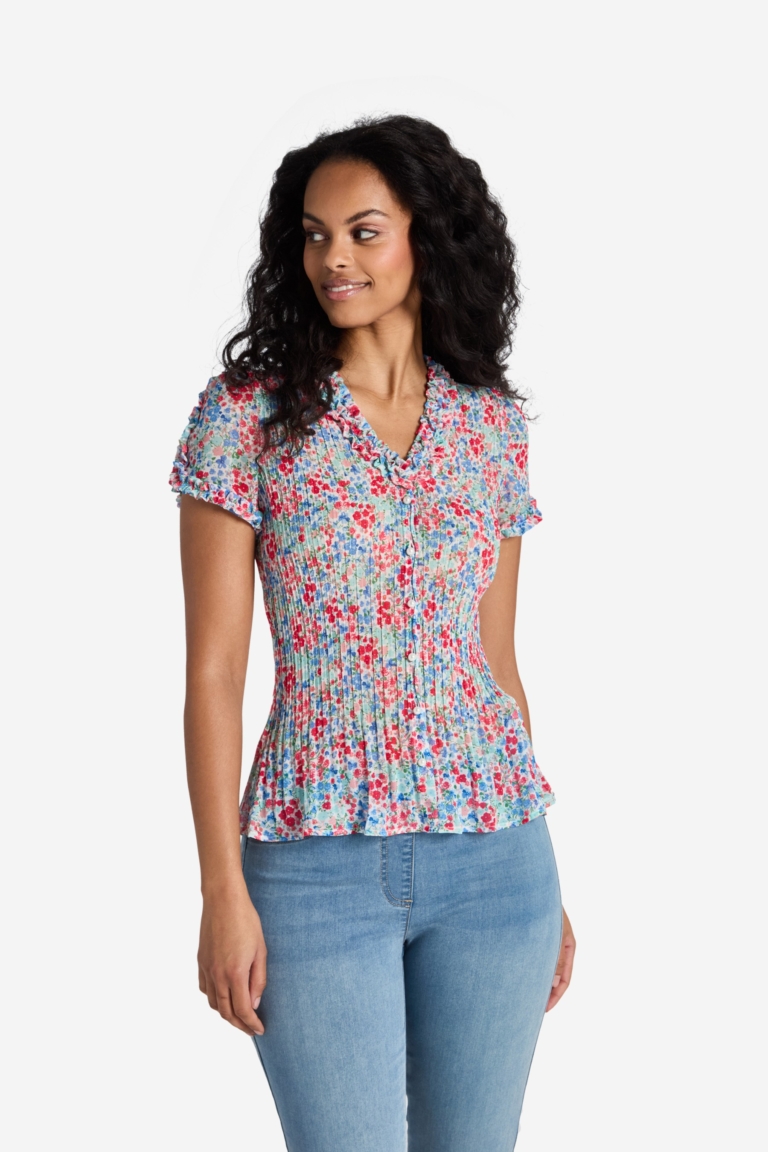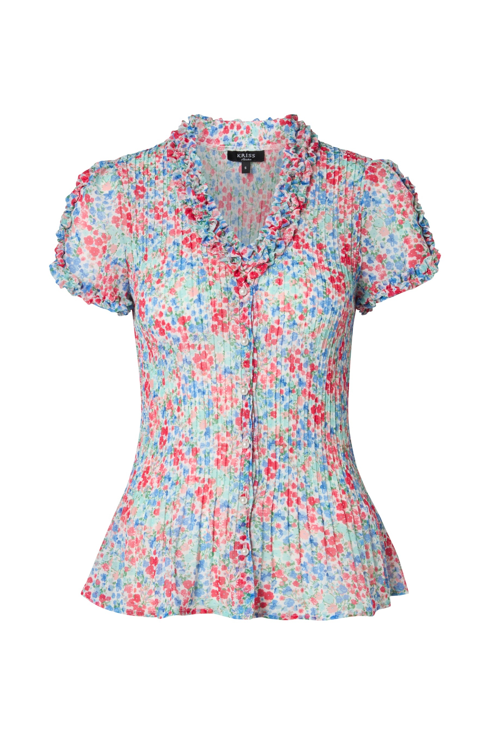 Plissiertes Blusenmodell mit kleingemustertem Print auf weichem Untergrund.