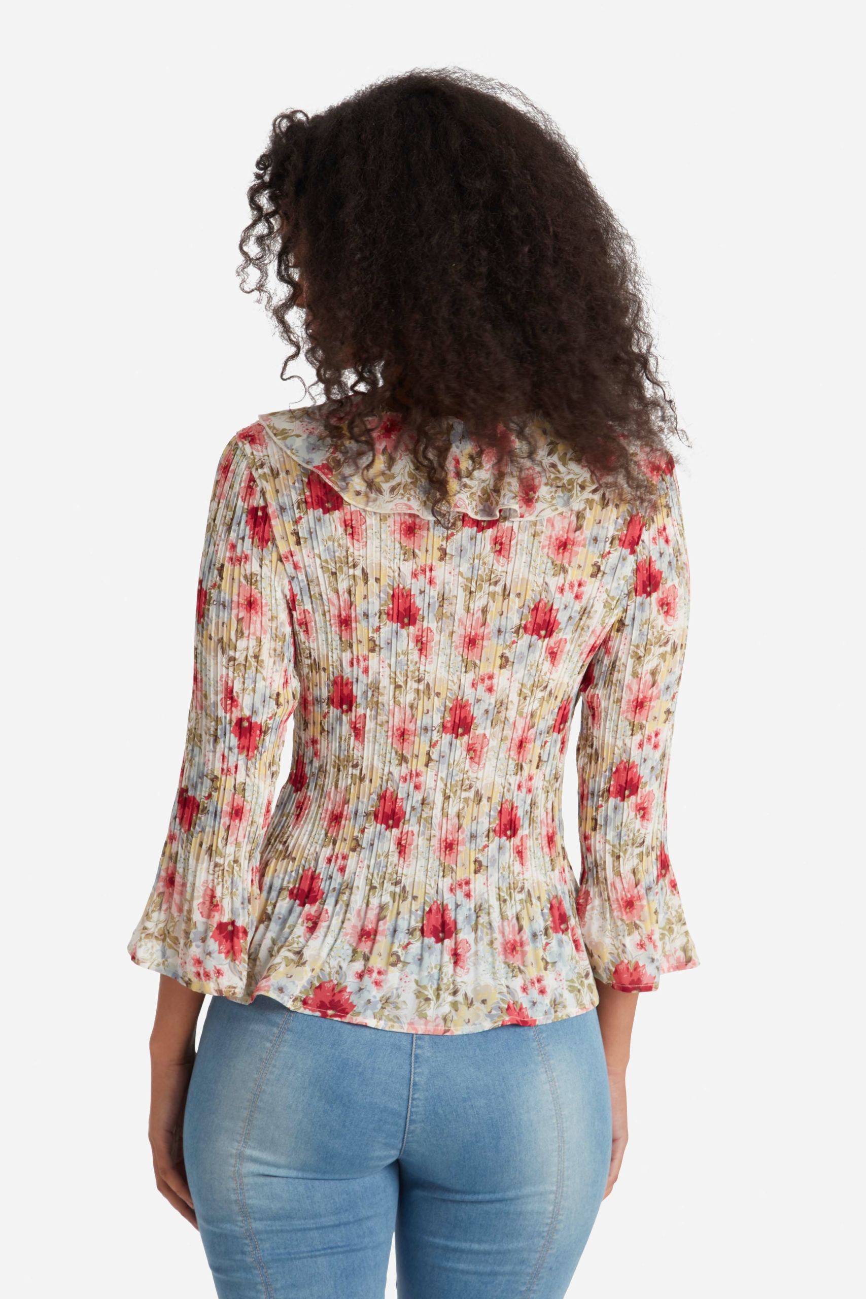 Plissierte Bluse mit Dreiviertelärmeln und farbenfrohem Print. Der V-Ausschnitt ist mit einem breiten geglätteten Volant versehen, der entlang der Knopfleiste in der Mitte verläuft. Die Falten der Bluse sind an Hüfte und Gesäß sowie am Ärmelende weiter geschnitten. Die Gesamtlänge in Größe S beträgt 61 cm vom höchsten Punkt.
