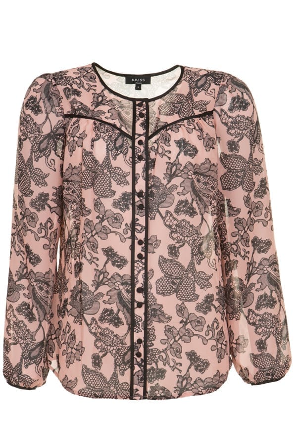 Ny trevlig modell på en slät blus med kvinnlig touch. Det vackra svarta blomprintet på en kall gammelrosa botten ger en känsla av tiden från förr. Den raka modellen har en något rundad nederkant, blusens . Blusen har ett avgränsat ok både fram och bak som är kantat med ett sobert svart kantband. Bandet döljer en liten rynktråd som skapar vidd och plats för kvinnliga former. Rund halslinje med kontrastrikt svart kantband. Även knappslån med små klädda svarta knappar är snyggt inramad. Lång ärm med ett kantat avslut som knäpps med en liten knapp.