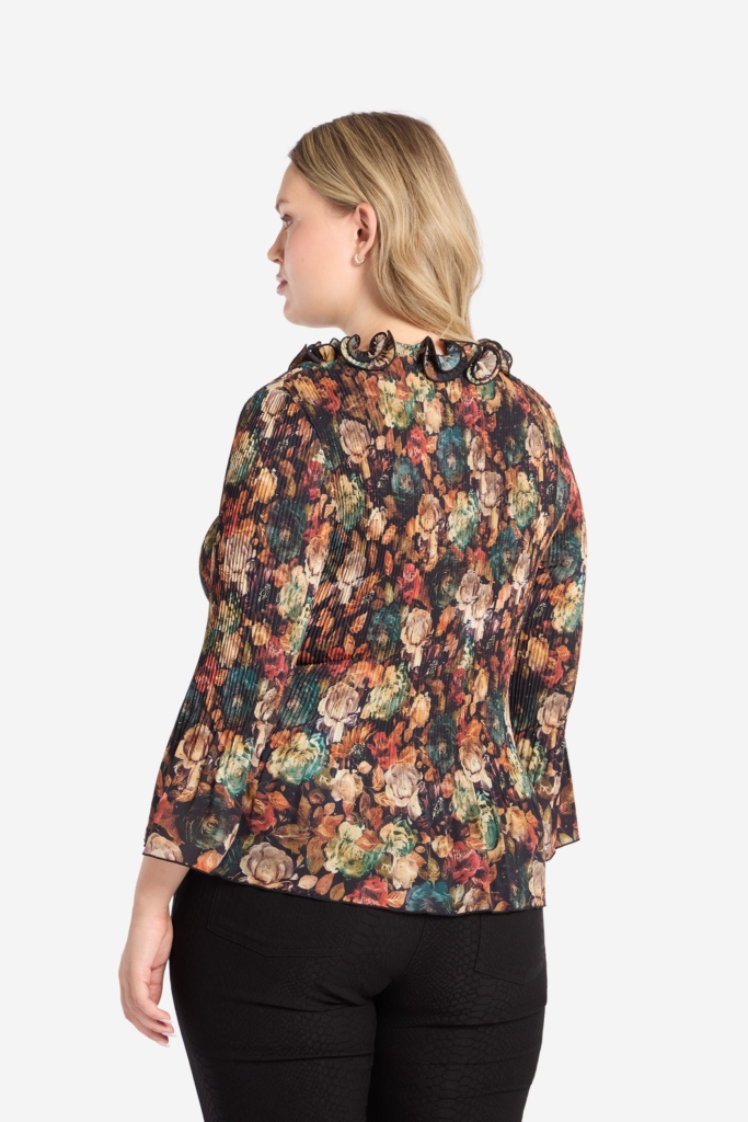 Plissee-Bluse aus glattem Stoff mit Print und einem schwarzen Meshrand an den Ärmelabschlüssen und am unteren Rand der Bluse. Den V-Ausschnitt zieren schöne Rüschen aus bedrucktem und unifarbenem schwarzem Mesh. Das Modell ist in der Taille leicht nach innen geschwungen und die Plissierung endet oberhalb von Hüfte und Gesäß und vor dem 3/4-Ärmelabschluss. Vorne wird die Bluse mit kleinen dezenten Kugelknöpfen geschlossen. Die Gesamtlänge in Größe S beträgt 62 cm vom höchsten Punkt unter dem Volant. Das Model auf dem Bild ist 175 cm groß und trägt Größe XL. Unsere großen Größen fallen normal aus, während unsere kleineren Größen etwas großzügiger ausfallen.
