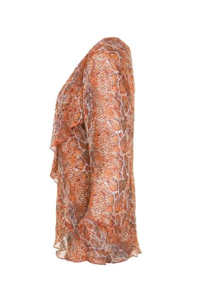 En av våra mest smickrande blusmodeller. Tygets läckra snakeprint i olika orange och brända toner ger en kaxig känsla och ett vaket intryck. Framstyckets pryds av diagonala våder med laskade avslut i svart. Tillsammans gör våderna och de mörka laskade kanterna underverk för figuren. Det släta bakstycket har två insnitt som ger en vacker siluett. Blusen är fodrad längs med kroppen. Den 3/4 långa genombrutna raka ärmen har ett laskat avslut.