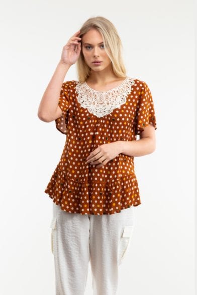 Blus i vår klassiska plissering med en v-ringad halslinje som pryds av ett brett band med rosor som är skapade av blusens tyg. Rosorna omges av en blå mesh med laskad kant som ger ett romantiskt men ändå tufft intryck. Blusens diskreta print går i den kalla skalan där rosa, lila, fuccsia blått och turkos ingår. Den ¾ långa ärmen släpper en aning i plisseringen i ärmslutet på samma sätt som den släpper runt höft och stuss. Båda dessa avslut pryds av en blå meshkant. Blusen är genomknäppt och aningen insvängd i midjan