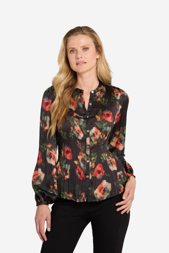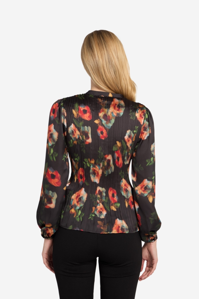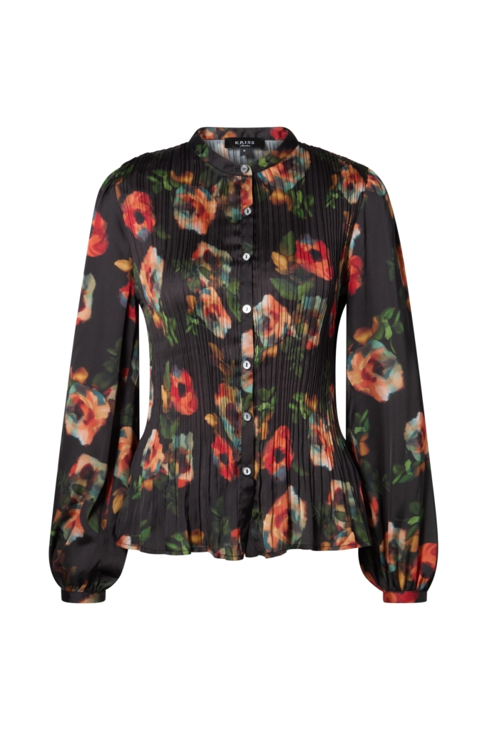 Plissierte Chiffonbluse mit weichem Tragegefühl und schönem Blumenprint. Schmaler Stehkragen, der vom Halsausschnitt bis vorne mittig in die Knopfleiste übergeht. Unauffällige Perlmuttknöpfe. Das Modell ist plissiert, an den Hüfen und am Gesäß jedoch glatter geschnitten. Lange, gerade Puffärmel mit Gummizug und Rüschen unten. Die Gesamtlänge in Größe S beträgt 63 cm vom höchsten Punkt. Das Model auf dem Bild ist 178 cm groß und trägt Größe Small.