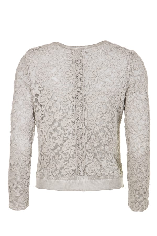 Denna underbara cardigan i spets har ett diskret blommönster kombinerat med enkla småmaskiga nätpartier. Den djupa något rundade halsringningen har kantats med ett tyg som är färgats i in i matchande nyanser. Längst ner runt höften finns även detta läckra tyg och spetsen löper vackert utanpå och bildar en liten vågformad bård. De hellånga ärmarna avslutas med et enkelt uppvik. De små pärlemoknapparna som är grupperade tre och tre på den kantade knappslån.