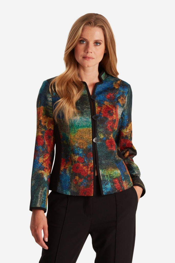 Blazer mit goldschimmerndem Jacquard-Muster, mehrfarbig und mit schwarzen Details. Die Jacke ist gefüttert, in der Taille leicht nach innen geschwungen und unten mit Schlitzen versehen. Schwarzer Kontraststoff an der Seite und unter dem Ärmel, der einen schlankeren Look verleiht. Rundhalsausschnitt mit schwarzem Stehkragen und schwarzen Saumbändern, schwarzer Knopfleiste mit Zierknöpfen vorne in der Mitte und schwarzem Rand am unteren Ende des langen Ärmels. Die Gesamtlänge in Größe S beträgt 59,5 cm vom höchsten Punkt unter dem Kragen.