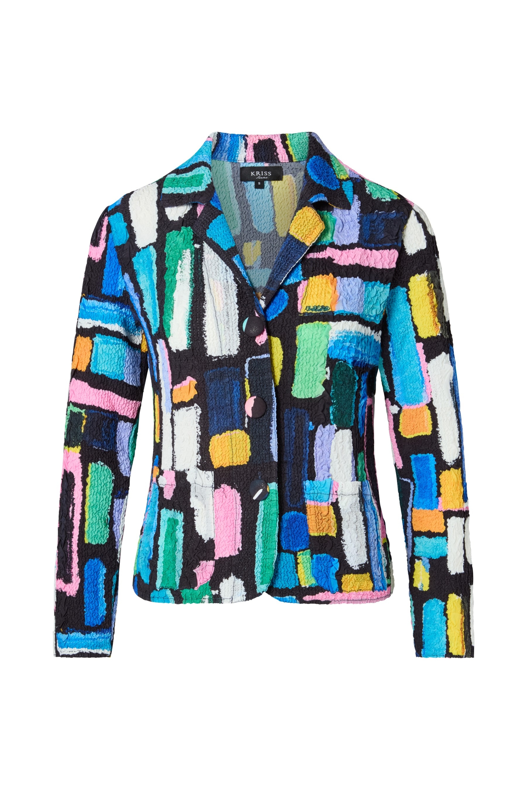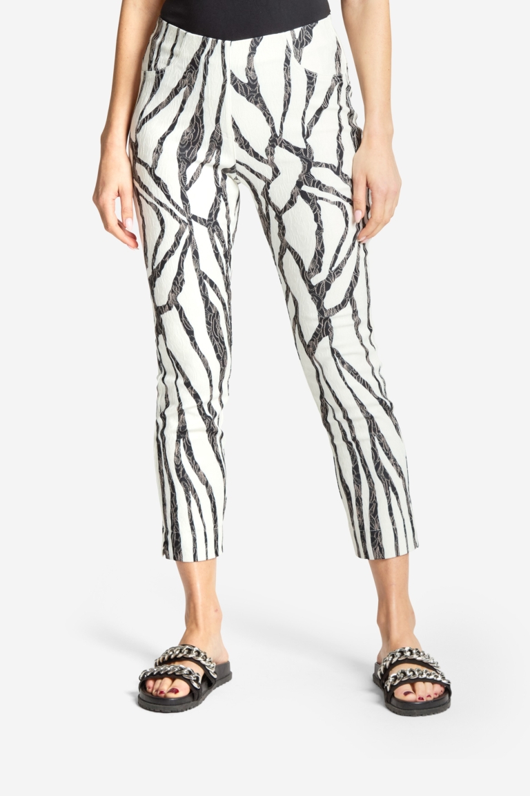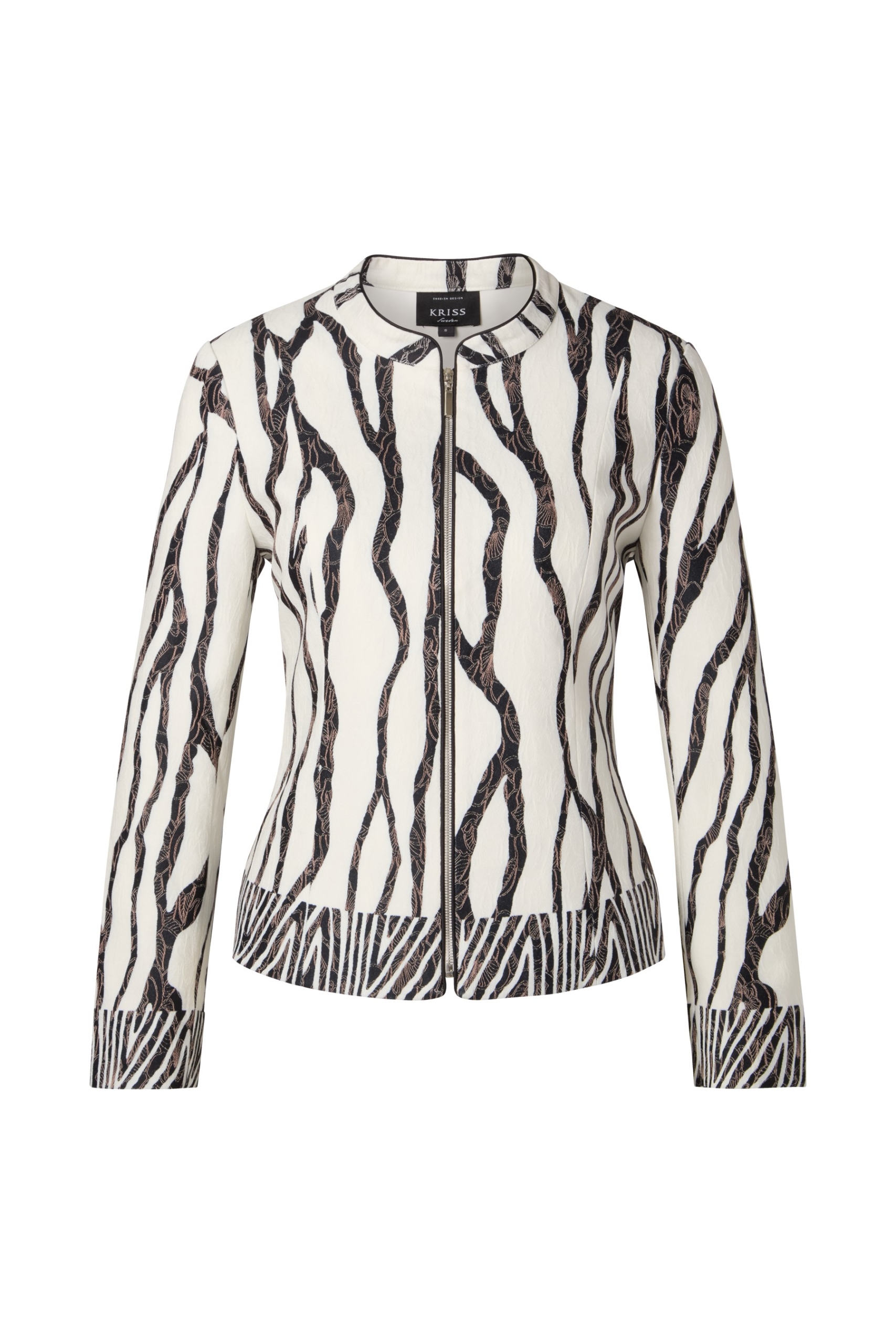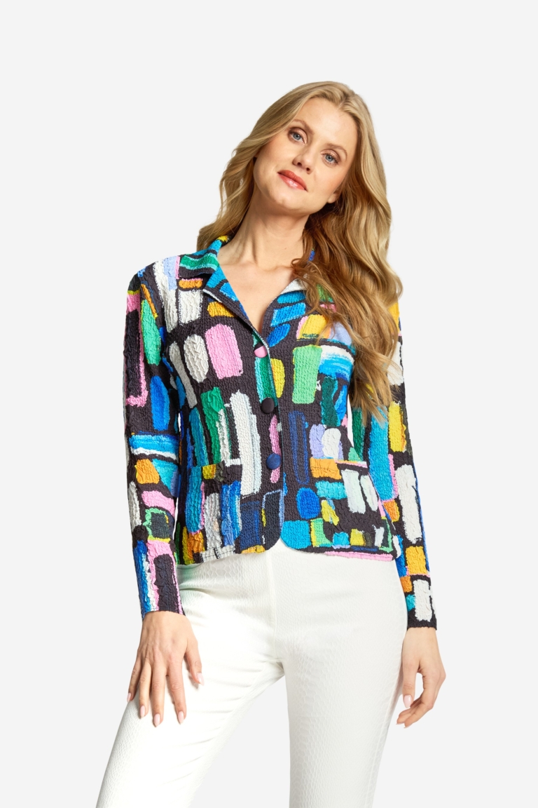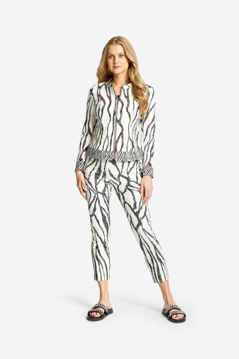 Eine legere Jacke mit breiten Streifen Ton in Ton mit Stehkragen, lange Ärmel mit Umschlag und eine Druckknopfleiste mit großen dekorativen Druckknöpfen. Zwei Klappen im Brustbereich lockern das Bild auf. Die Seitenschlitze lassen einen größeren Bewegungsspielraum zu und die seitlichen Eingriffstaschen bieten Platz für Kleinigkeiten. Der Vorderteil ist teils gefüttert. Passend dazu haben wir im Programm die Byxa Mondo. Rückenlänge in Größe S beträgt 71 cm.