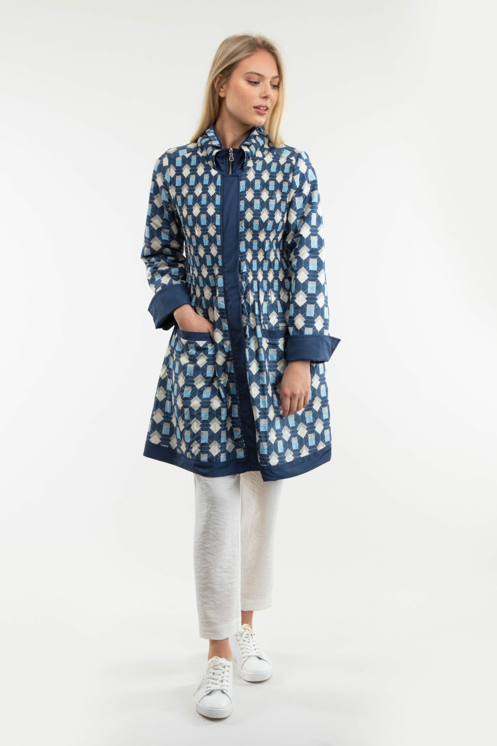 Sehr eleganter wendbarer Mantel, der auf der einen Seite mit einem trendigen Muster bedruckt und auf der anderen Seite uni blau ist. Wunderschönes Kräuselmuster sowohl auf der Vorder- als auch auf der Rückseite des Oberteils. Der Mantel hat einen doppelten Stehkragen und der Reißverschluss ist vorne unter einer einfarbigen Knopfleiste mit verdeckten Druckknöpfen versteckt. Der Mantel ist unten etwas weiter geschnitten und dort mit einer einfarbigen blauen Paspel versehen. Die bedruckte Seite ist vorne mit großen Taschen versehen. Die Gesamtlänge in Größe S beträgt 92,5 cm vom höchsten Punkt unter dem Kragen.