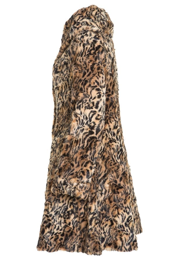 Höstens mysigaste och kaxigaste kappa i brun/beige leoparmönstrad fuskpäls som skimrar vackert. Den A-linjeformade modellen sitter till i midjan och är klockad nedtill och har en rundad nedvikt krage som är nersydd framtill. Kappan knäpps med glansiga, stora knappar mitt fram och har diagonala dolda fickor. Modellen är helfordrad och ärmen har ett litet sprund i nederkant som ger ett snyggt uppvik vid behov.