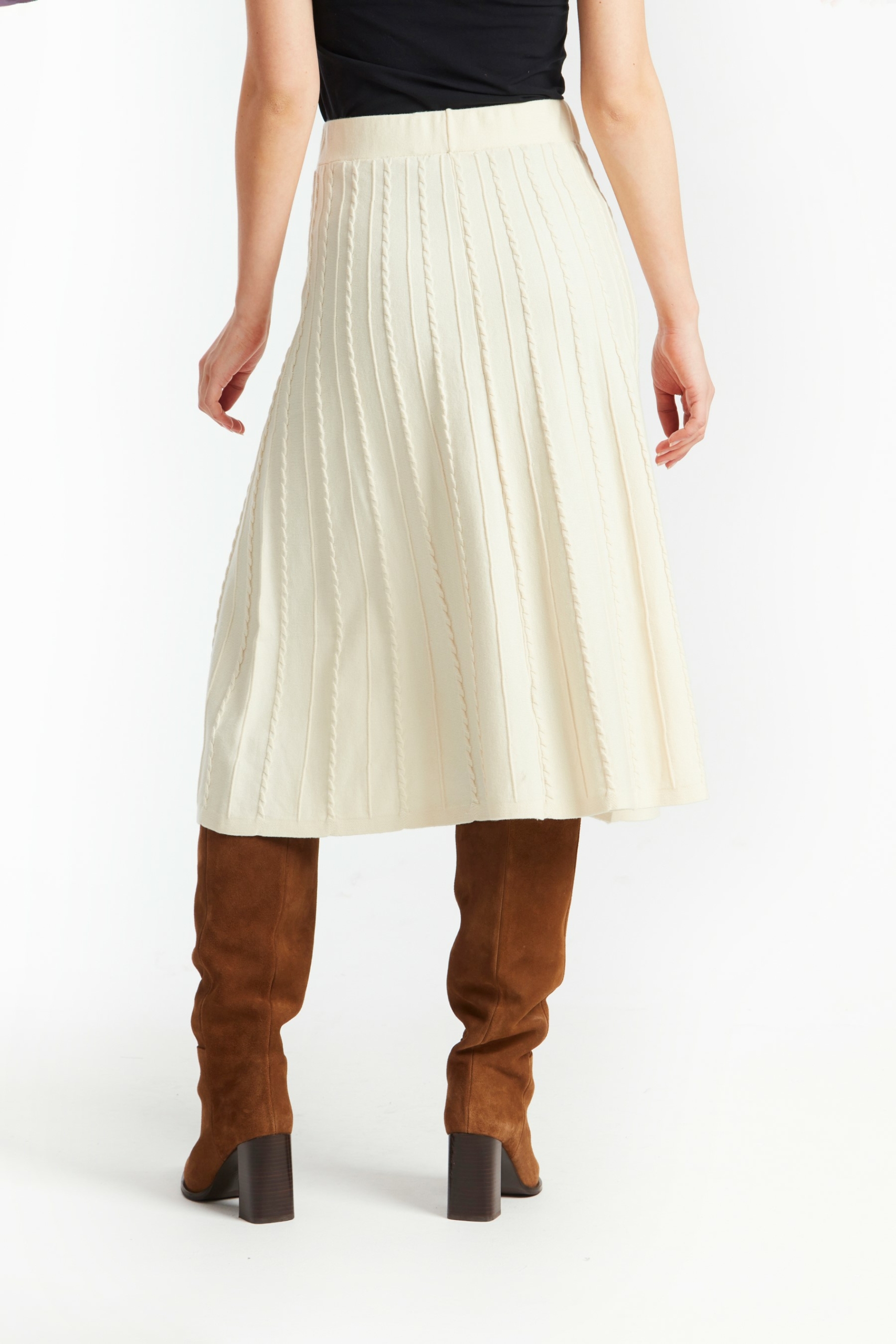 Strickrock mit gemusterter Strickstruktur und schönem Fall. Breiter Gummizug an der Taille und Glockenmodell. Wunderschönes Strickmuster, das natürliche vertikale Webmuster im Rock erzeugt. Die Länge in Größe S beträgt 75 cm.