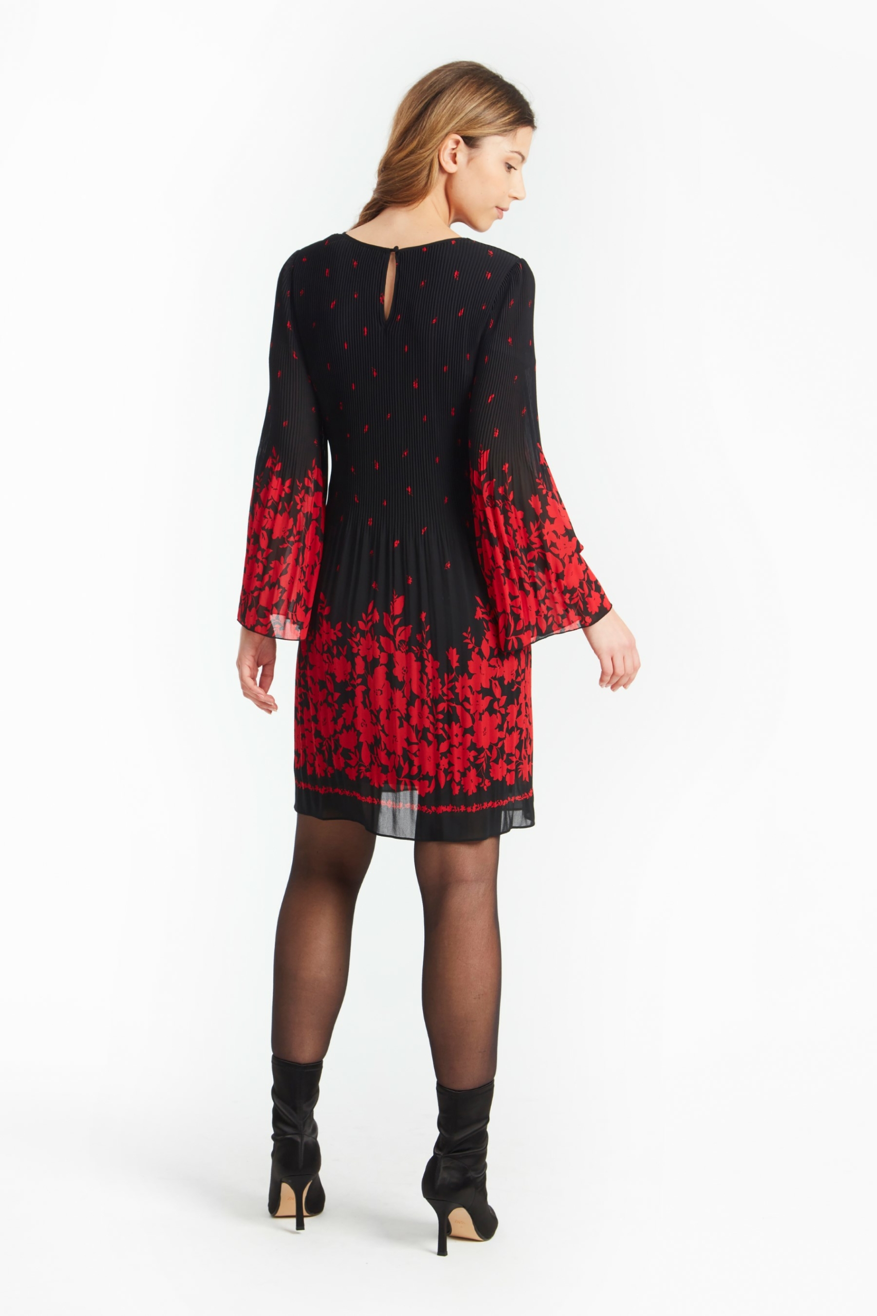 Hübsches Kleid aus recyceltem Polyester mit einem sehr weichen Tragegefühl im Stoff. Durchbrochene Passe mit schwarzen Banddetails vorne. Das schwarz-rote Kleid mit dekorativer Borte und enger Plissierung oben hat eine leicht nach innen geschwungene Taille und einen weit geschnittenen Rockteil, der mit einem schwarzen Rand endet. Lange Ärmel, die ebenfalls ausgestreckt und unten weit sind. Das Kleid hat ein stretchiges Futter und einen Rundhalsausschnitt mit Schlitz und Knopf hinten. Die Gesamtlänge in Größe S beträgt 96 cm.