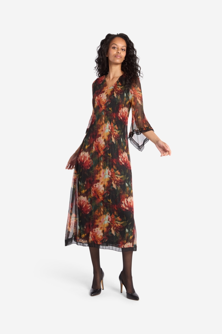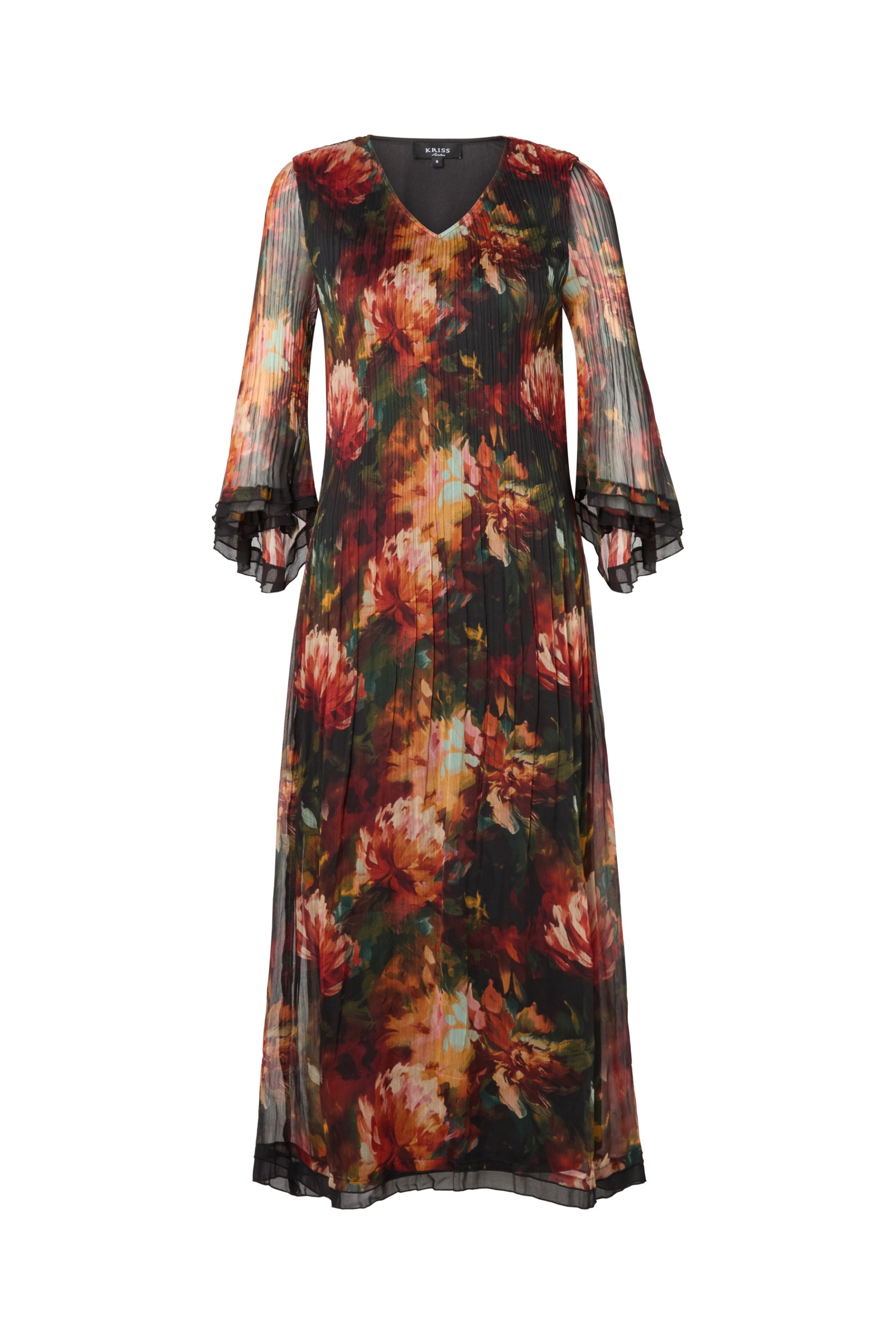 Sommerkleid aus Viskose-Krepp mit zarten Blumen auf weißem Untergrund. Der V-Ausschnitt ist mit einem Zierband versehen und die weiten Ärmel mit Schlitz verleihen dem Kleid eine elegante Ausstrahlung. Das Kleid hat eine hohe Taille und der Brusteinsatz verleiht ihm eine schöne Passform. Das Kleid ist mit einem weißen Viskosefutter versehen und hat einen leicht ausgestellten Rock, der bis knapp unter das Knie reicht. Die Seiten sind mit Bändern versehen, die sich hinten zubinden lassen. Die Länge in Größe S beträgt 105 cm vom höchsten Punkt.
