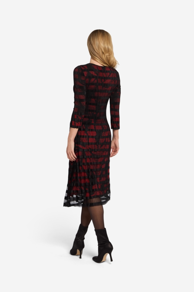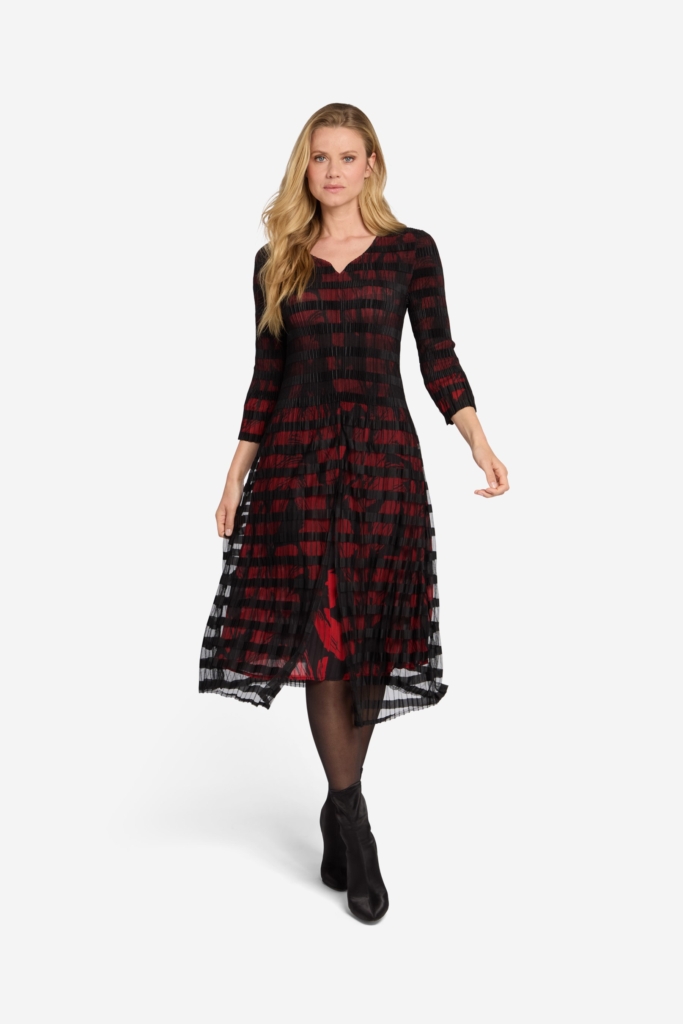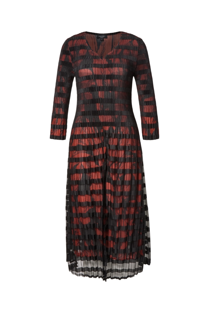 Wunderschönes Kleid in anregendem Modell mit zwei Lagen Stoff. Die untere Schicht besteht aus plissiertem Chiffon mit rot/schwarz Muster und der oberen Lage aus plissiertem schwarzem Mesch-Gewebe mit Querstreifen. Dunklerer Teil der Taille, der einen Schlankheitseffekt verleiht. Das Kleid hat einen V-Ausschnitt und 3/4-Ärmel, die unten ausgestreckt sind. Die Gesamtlänge des Kleides beträgt 118 cm in Größe S. Das Model auf dem Bild ist 178 cm groß und trägt Größe Small.