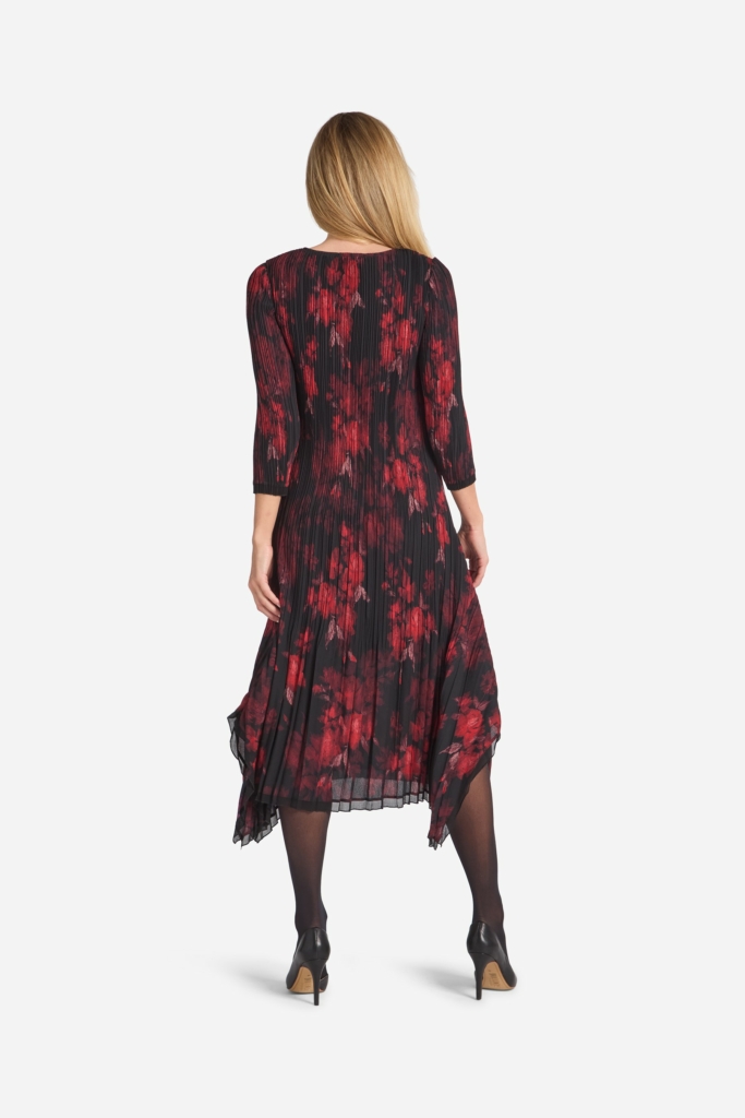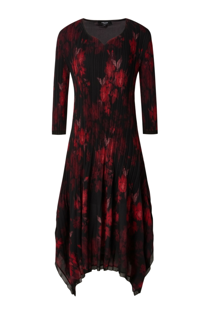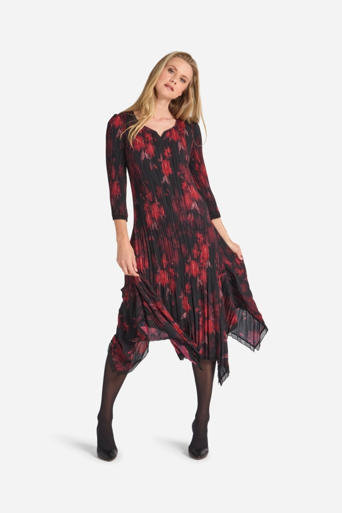 Schönes Kleid mit schwarz-rotem Herbstprint in seidenweichem Material, das sich leicht pflegen lässt. Das plissierte Modell ist oberhalb der Brust figurgbetont und über der Hüfte und unten weiter geschnitten. V-Ausschnitt und 3/4-Ärmel mit schwarzem Chiffonbesatz an den Ärmelabschlüssen. Das Kleid hat unten einen unebenen Abschluss und einen schwarzen Chiffonrand. Die Gesamtlänge in Größe S beträgt 111 cm ab dem höchsten Punkt. Das Model auf dem Bild ist 178 cm groß.