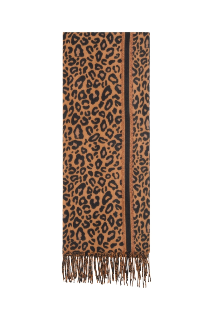 Strickschal mit angenehmer Haptik und Leopardenmuster und Streifen.Die kurzen Seiten sind mit zusammengedrehten Fransen versehen.