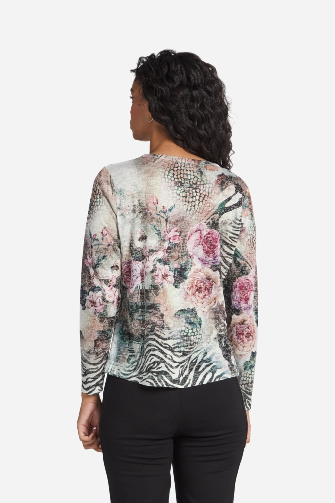 Einzigartiges Oberteil und wunderschöner Print mit silbernen Details. Das Material des bedruckten Burnout-Look-Tops ist dünn und geschmeidig und die Passform ist in der Taille leicht nach innen geschwungen. V-Ausschnitt und lange Ärmel. Die Länge in Größe S beträgt 61 cm vom höchsten Punkt.