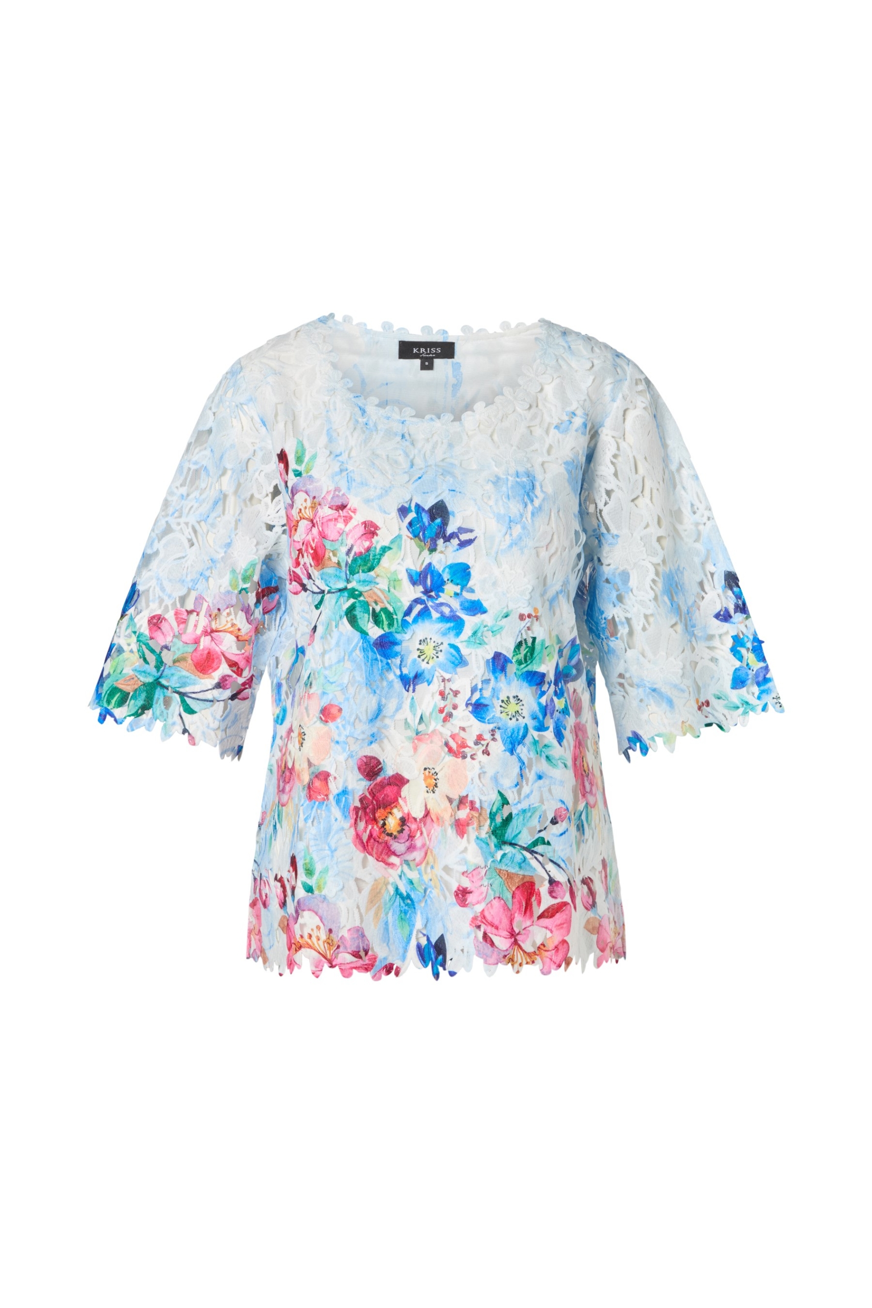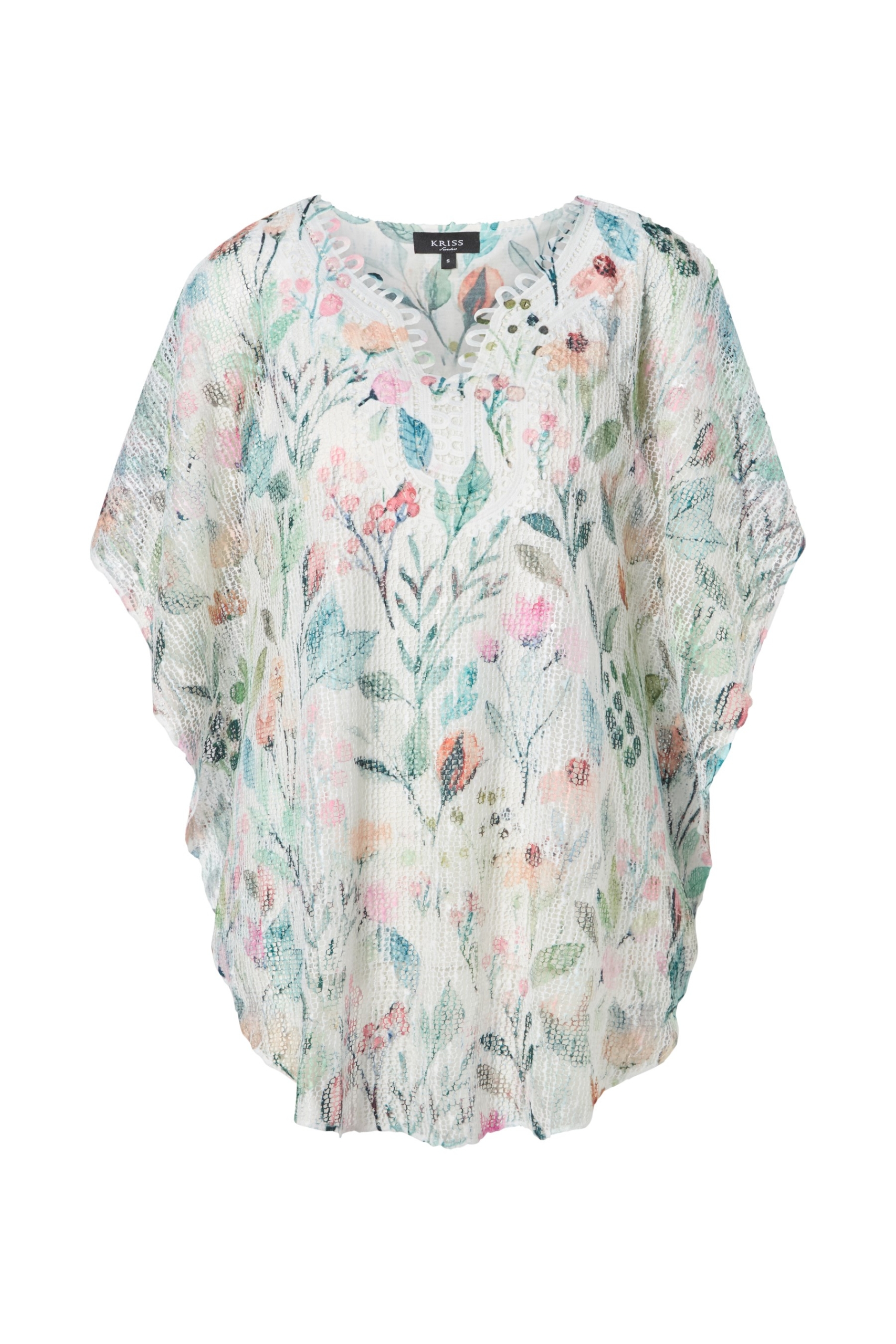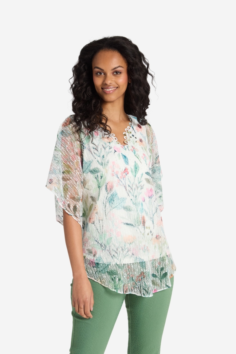 Großzügiges Blusenmodell aus Metallic-Stoff, das in schimmerndem Material an einen Poncho erinnert. Gefüttert mit einem weichen, stretchigen Viskosematerial in Schwarz. Die Ärmel entstehen durch Abnäher auf beiden Seiten in Höhe der Taille. Die Bluse hat einen Rundhalsausschnitt mit einigen Falten vorn und hinten in der Mitte. Die Gesamtlänge in Größe S beträgt 73 cm vom höchsten Punkt und die Breite von Ärmelabschluss zu Ärmelabschluss beträgt 108 cm.