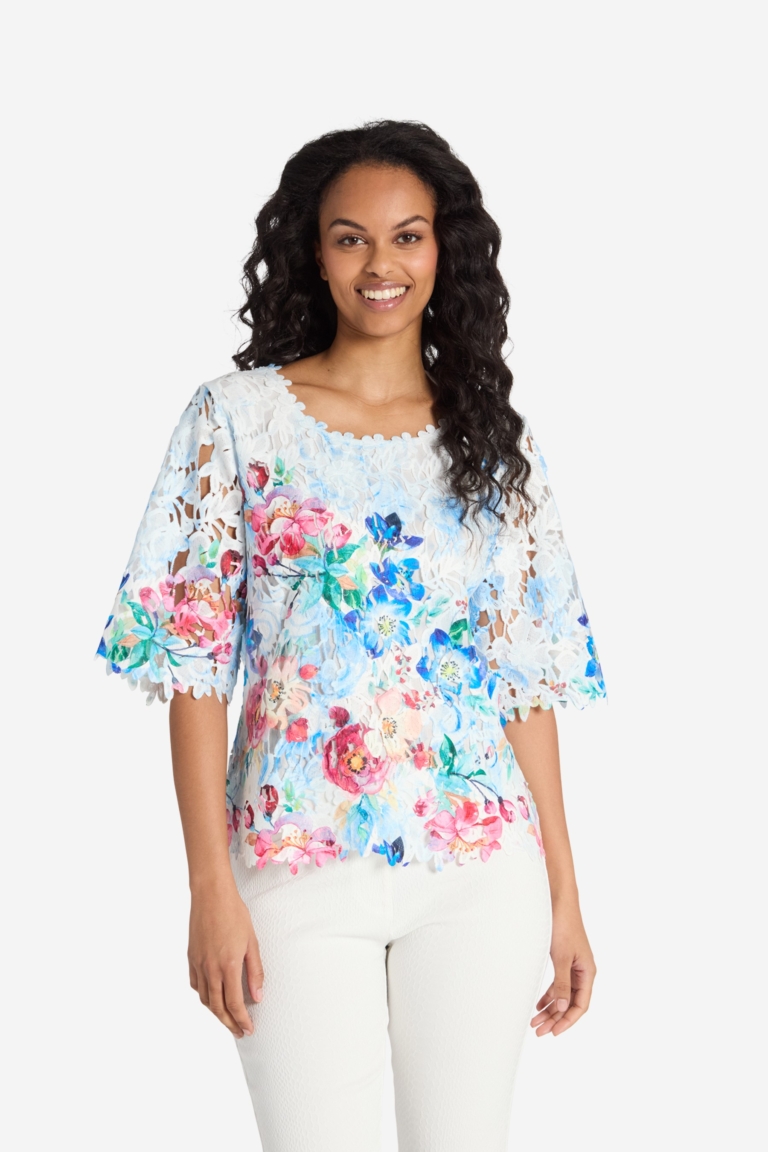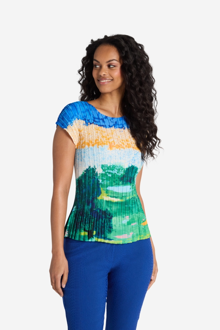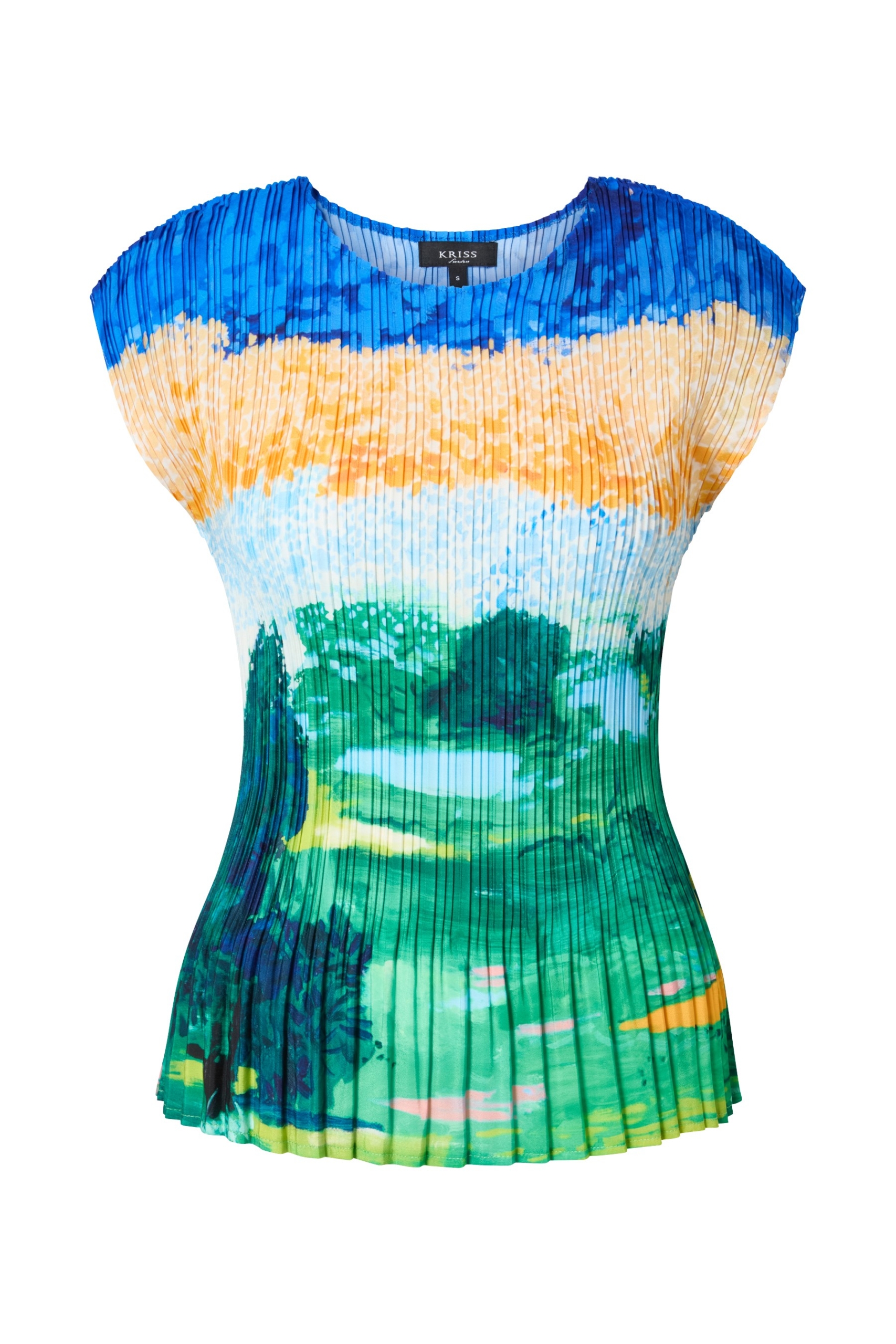 Großzügiges Blusenmodell aus Metallic-Stoff, das in schimmerndem Material an einen Poncho erinnert. Gefüttert mit einem weichen, stretchigen Viskosematerial in Schwarz. Die Ärmel entstehen durch Abnäher auf beiden Seiten in Höhe der Taille. Die Bluse hat einen Rundhalsausschnitt mit einigen Falten vorn und hinten in der Mitte. Die Gesamtlänge in Größe S beträgt 73 cm vom höchsten Punkt und die Breite von Ärmelabschluss zu Ärmelabschluss beträgt 108 cm.