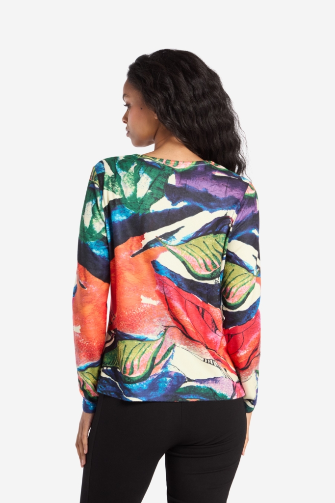 Cooles Top aus Trikot mit einem großgemusterten Print in wunderschönen Farben. Der Pullover ist leicht tailliert und hat einen geraden Saum. V-Ausschnitt und lange Ärmel. Die Gesamtlänge in Größe S beträgt 60 cm vom höchsten Punkt. Das Model auf dem Bild ist 178 cm groß und trägt Größe Small.