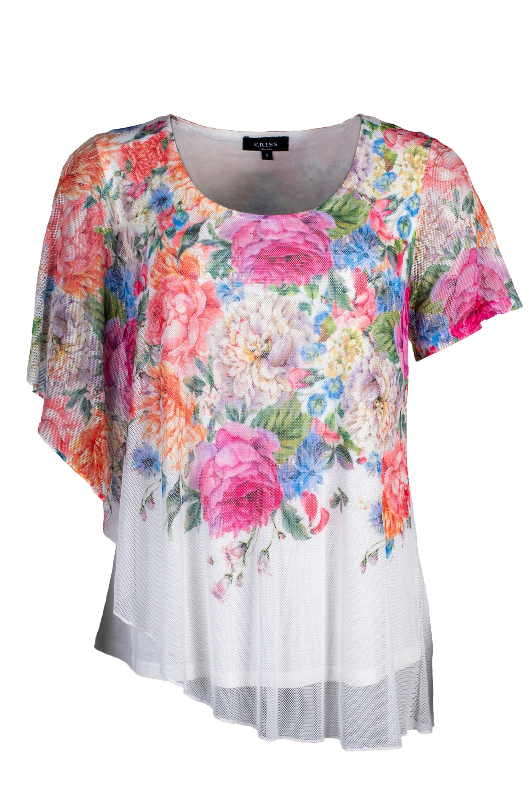 Asymmetrisches Top aus floral bedrucktem Netz
