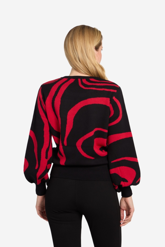 Weicher Strickpullover in Schwarz mit rotem, verschnörkeltem Muster. Schwarzer, gerippter Halsausschnitt und schwarzes Rippstrickbündchen am unteren Rand des Kleidungsstücks. Lange Ballonärmel mit breiter Samtborte, breite Rippstrickbündchen am Ärmelabschluss. Die Gesamtlänge in Größe S beträgt 59 cm vom höchsten Punkt. Das Model auf dem Bild ist 178 cm groß und trägt Größe S.